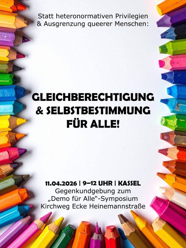 Wir rufen zur Protestaktion gegen das „Demo für alle“-Symposium auf, das am Samstag, 11. April 2026, in der Kasseler Stadthalle stattfindet.